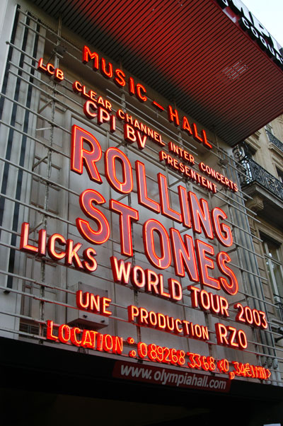 最終日 Olympia Show #84 いよいよ、今夜は伝説になるかもしれない Olympia でのshow。 前座(The Burn)が終了し、セットを撤去、「彼らの」ステージが整備される。 ステージが小さいため、スタッフはかなり少なめ。今夜はカメラクルーが そこかしこにいて、慌しくカメラ位置の確認(ステージに備え付けた固 定カメラの角度)、カメラ可動域の確認などが行われている。フランス語のカン ペを床に貼っているスタッフが 固定カメラのスタッフに「ここから下は映さな いように気をつけて」と指示を飛ばしている。ちょっとした緊張感がステージの上 を支配。前の2公演では感じなかったこと。パリでの過去2回のSHOWは 9 :45過ぎには始まっていた。しかし、今夜は50分をまわっても始まる気配ナ シ。カメラクルーのお兄さんからは(前回 Stade De Franceから顔馴染に)「も うあと5分で始まるよ」と身振りで合図を受けるも始まらない。スタッフに指示 は出ているようだが、実際の開始が遅れているみたいだ。フロアの観客は「まな 板の上」にのった状態。10時少し直前に客電が落ちる。悲鳴に近い歓声が高まり、 そして皆が息を飲む瞬間・・・キースがチャーリー脇の暗闇から飛び出してきて、 彼の姿をスポットライトが途中で捉える。前身頃に細工のされた(フリルが細かく寄 っているような)白いドレスシャツ姿(もちろん裾はだらーん)のキースは会場 を1回見回してから すぐにリフを弾き始める。1曲目はStart Me Up。会場は 客電が落ちた時から走り初めていて、このナンバーで加速し、熱気も上昇。同 時に私の中では メーターが振り切れ、周りがどうなのか、観衆はどんな感 じなのか、なんて頭がまわらない。見えるのはステージだけ。そう広くもないス テージなのに無限の可能性を秘めているように思えた。MICKはTシャツに黒 いベスト、黒にラメの入った透かし網のスカーフを巻いて登場。今まで聴きたく て聴けなかった曲が次から次へ、息をつく間もないぐらいに演奏される。その幸 せとはウラハラに心臓が悲鳴をあげそうだった。身体がついていかないぐらいの 速度で攻められて、ダウン寸前。音に身を委ね、Mick, Keith, Charlie, Ronnie に目を奪われ、(誰を見てよいのやら、迷うぐらいに皆が生き生きして魅力的) 、彼らが本当に楽しそうに演奏する姿を見ていた。これを見るために巴里まで飛 行機で来たのかも・・・そんなことを思った。 Charlieがこんなに微笑みながら プレイするのも初めて見た。Ronnieは No Expectationで スライドギターを弾く とき少し茶目っ気を出しながら演奏。 こんなスゴイものを聴かせてもらって、見せてもらって・・・と思い始めている と キース・コーナー。 The Nearness of youはそんな白旗寸前の泣きそうな気 持ちに染み入る優しい歌い方、甘いメロディ。専務派でなくても溶けそうなぐら いの最上級ナンバー。続く Before they make me runで 再び立ち上がる力を分 けてもらって、Mickが再びステージに登場。 紫色の光沢あるシャツ、お揃 いに見えるジャケット、そしてベージュのソフト帽子。パリ、オリンピアを意識 したような洒落た出で立ち。歌の途中でそれまでかぶっていた帽子を優雅に後ろ へ飛ばす。ロニー・アンプの前にその帽子が落ちる。全てがSHOW。 Love Train では コーラスの2人(Bernard, Lisa嬢)を従え、ステージ中央の「でべそ部分 」で熱唱。Respectable, Rip this jointと Mickの熱唱が続く。顔を紅潮さ せ、首までも赤くなるほど真摯に歌う姿は神々しく見えた。生まれついてのパフ ォーマー。ここまで真剣に歌う彼の姿、プロの根性。それだけでも 値段なんて つけられない価値がそこにあった。これこそ最高の贈り物。その場に立ち会えた ことは一生の宝。この世に存在する欲の中で最大級で最高の瞬間を味わってしま った、2003年7月11日金曜日 パリ、オリンピア。 クラブショウを知ってしまった私はこれからもこの興奮を求めてしまうだろう。 しかし、クラブショウだけではなく、箱の大きさに合わせて様々な魅力を振り撒 く彼らに再び会うために、アリーナショウも見たくなるだろうし、スタジアムだ って見たくなる。全てのファンを魅了しつづける彼ら、The Rolling Stones。ラ イブショウを通して彼らと時間を共有できることの幸運にあらためて、手を合わ せたくなる。パリでの出来事は今後の私の人生計画を狂わせるかもしれない、そ んな予感を胸に抱きつつ帰国の途についた。 <終わり>