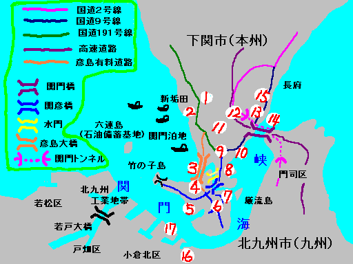 - 彦島有料道路(彦島大橋部分) 通勤時にたまに通る。橋の下が早鞆の瀬戸(ミニ海峡) 風車のあるパーキングからの響灘(日本海)の眺めがお気に入りである。
