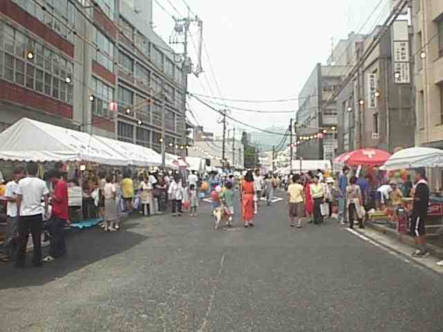 市役所のある南部町(通称では唐戸に含まれている)から下関駅近くの豊前田町まで国道9号線に並行している、この中通りがバザーや露店などの会場です。写っているのは南部町の市役所や保健所のある官庁街(?)付近で、浅葱がお手伝いするボランティア団体や各種の福祉施設、ガールスカウトなどの慈善団体はこの一等地に出店することが許されています。まだ時間が早いので人出は少ないです。(26KB)