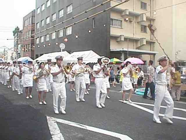 続いては下関市役所ブラスバンドの登場です。やっぱりブラスバンドってカッコイイなぁ〜 最前列右端、ピンクのパラソルのそばに写っている女性は、所属は違いますが浅葱と同じ職種の人です。彼女のお姉さんと浅葱は高校時代同級生でした。(26KB)