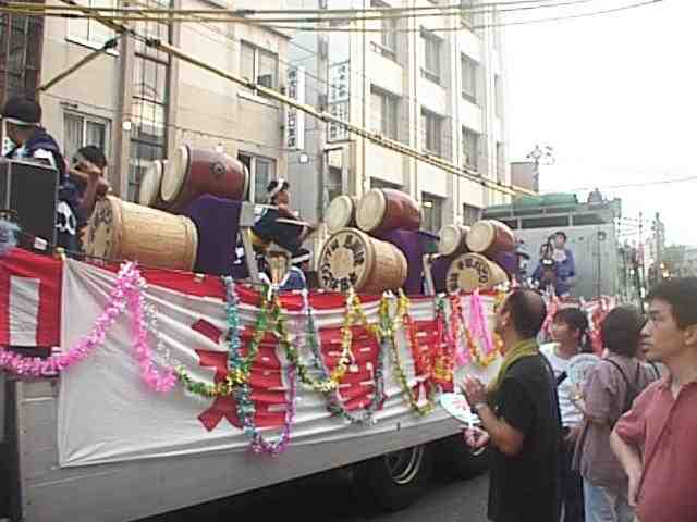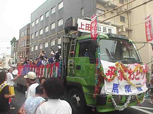 お次は平家踊り保存会の皆さんです。トラックの荷台に太鼓、三味線、歌い手さんが乗って演奏しています。さすがにこの上では輪になって踊るわけにはいきませんね。保存会にもいくつか派があって、これは馬関連の皆さんです。(28KB)