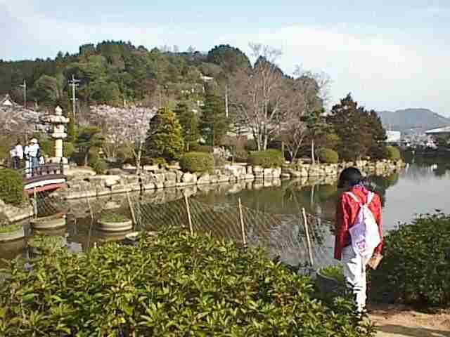 庵周囲は梅・椿・桜それに花しょうぶの名所です。この池のネットから左側は花しょうぶが植えられています。今はまだ葉っぱだけですが。(28KB)