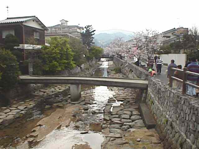 (14:23)国道から離れて城下町長府の路地を歩きます。この時点で浅葱はもうヘトヘト。背中のリュックに入れている浅葱の三種の神器「デジカメ」「携帯」「双眼鏡」がとっても重い。友達にそそのかされて、格子状の路地を本当は大回りしないとならないのに最短でバイパスして超近道してしまいました。これで順位もしっかり急浮上よ。きゃははは。これは本来のコースのそばを流れる壇具川です。水は少ないけれど澄んでいてゴミもない美しい川です。(30KB)