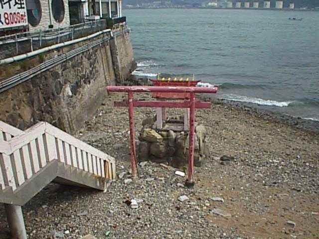 この鳥居のあるところは「平家の一杯水」という旧跡です。なんでも、喉が渇いて死にそうな平家の武者がこの海岸の砂を掘って湧き出した水を両手ですくって飲んだら真水だったので、もう一杯飲もうとしたら今度は海水だったという話です。詳しくはまた常設展のほうでご紹介していくことにしましょう。(46KB)