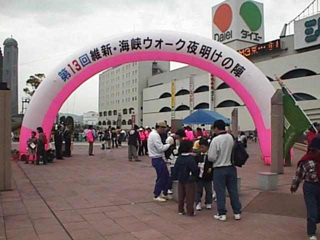 (17:41)ようやくゴールの「夜明けの陣」(シーモール下関前の人工地盤)に到着です。文頭の時刻はデジカメで記録された撮影時刻なので、本当はもっと早く到着していたと思うんだけどぉ〜 子連れの友達を探したり記念品をもらったり休憩したりご褒美のお菓子(これは浅葱が勝手に言っているのではありません。ゴールで主催者側からもらえるのです)を食べていたりしたら遅くなっちゃったんじゃないかな? (30KB)