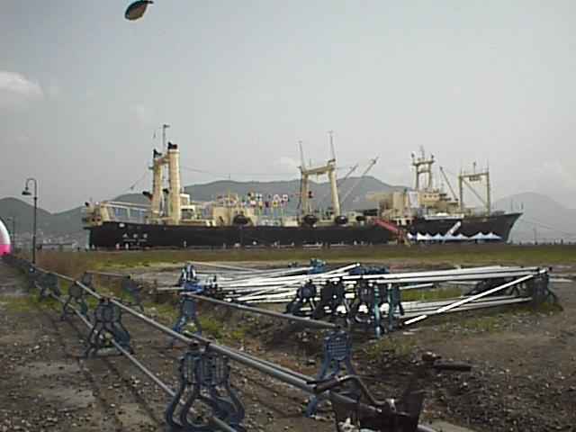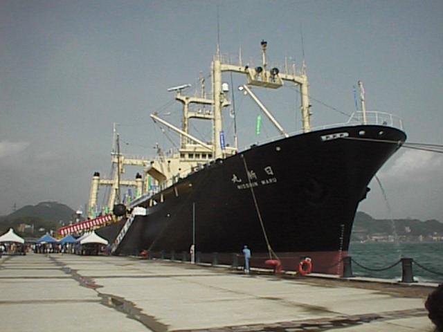 あるかぽ〜との岸壁に着いている捕鯨母船「日新丸」です。