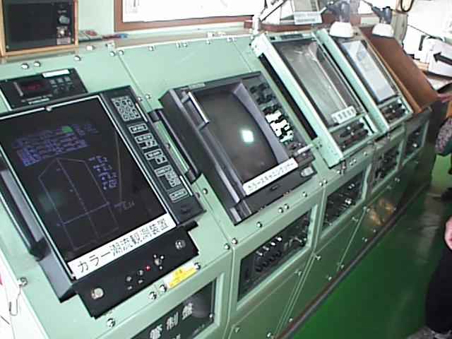 ここは早い話がたくさん機器があるところ。自発的に質問する以外には説明がないので、この機械好きの浅葱でもよくわかりませんでした。操舵室ならどこかにステアリングホイールがないと操舵できないと思うんですけど、コンピュータの類に気を取られて、あったかどうかもわかりませんでした。(33KB)