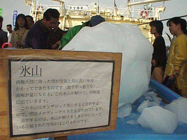 甲板では見学者に冷たい氷水が振る舞われました。もちろん先ほどの南極の氷ですよ。でも水はその氷が溶けたものかどうかは確認していませんけど、たぶん日本の水道水ということはないでしょう。それじゃ意味がないもんね。