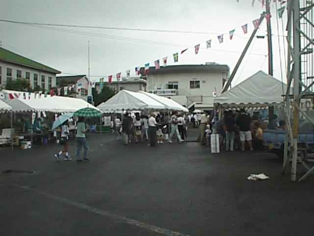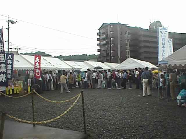 天気も今にも雨が降りそなくらい悪いし、そのせいか「お客さんがぞくぞく来ている」というには程遠い状況です。張り切って揃いの法被を着ている社員のおじさんたちがなんだかかわいそう。(30KB)