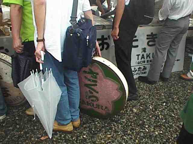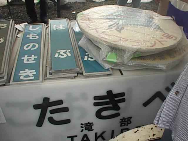 下のは駅のプラットホームに設置してある駅名板。¥3,000也。上左の細長くて青いのは同じくプラットホームの屋根の柱などに取り付けてある駅名札。¥3,000也。上右は列車のヘッドマークで、浅葱が来たときはすでにブルートレインなどの人気列車はすべて売り切れでした。ちなみに売れ残っているこの「呉ポートアイランド号」は¥15,000ですが、ブルトレのは¥100,000だそうです。(25KB)