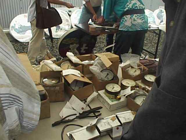 これは小物類です。箱に入っている丸いのは圧力計です。¥1,000也。その手前の黒いペンチのようなものは、現場では気が付かなかったのですが、今考えると改札の切符切りバサミ(正式名称不明)ではないかと思われます。価格未確認。さらにその手前の銀色の箱は灰皿です。今は在来線は全車禁煙がほとんどでしょうから不用になったわけですね。¥700也。(28KB)