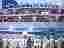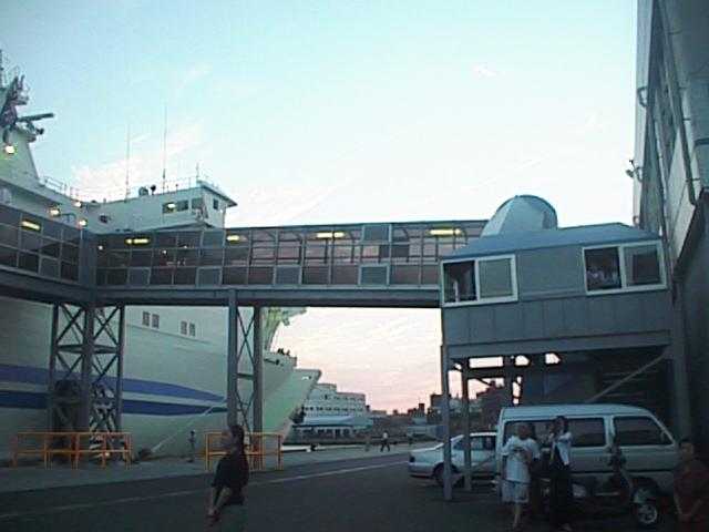 右舷中央部から船首方向です。この空中の通路、飛行機でもありますけど何と言う名称なのでしょうか? 出国手続きをした人がここを通って乗船するのです。浅葱がどさくさに紛れて(?)岸壁からこっそりと船に乗り込もうとしてもできないようになっています。(27KB)
