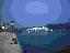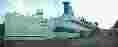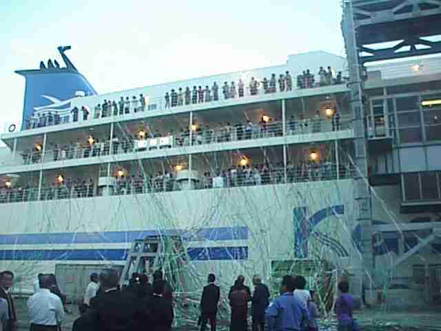 船が岸から離れてしまうと見送りの人たちや報道陣はちりぢりになって帰っていきました。浅葱はしばらく残っていましたが、6分後ようやく関門海峡に出て行った時点(この写真)で帰ることにしました。倉庫の間を抜けてターミナル前の道路に出たとき、ボーッという低い汽笛と、それに答える(と館長は思ったのである)ポーという高い汽笛が大きく聞こえてきて、べつにこの船に浅葱の知っている人が乗っていて、再び会うことはないというわけでもないのに、無性に悲しくなりました。就航のお祝いの目出度い日なのに・・・(28KB)