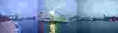 右の方、黒く写っている2隻のタグボートに引かれて、はまゆうはゆ〜っくりと離岸を始めました。(48KB)