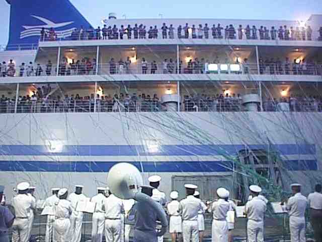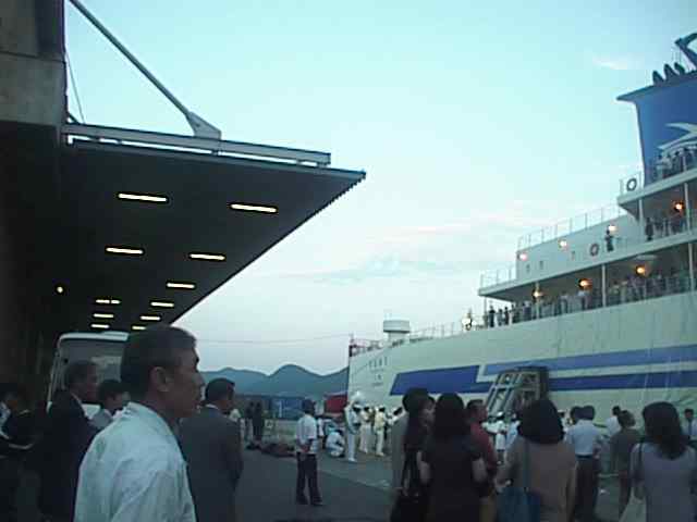 暗くなってきました。19:00の出航まであと5分です。市役所ブラスバンドが演奏をしています。後で聞きましたが、本日この船には江島下関市長と当市出身歌手の山本譲二も乗っているそうです。市長の用務はともかく、山本譲二は船内でディナーショウでもするのかね〜?(30KB)