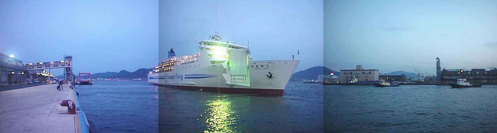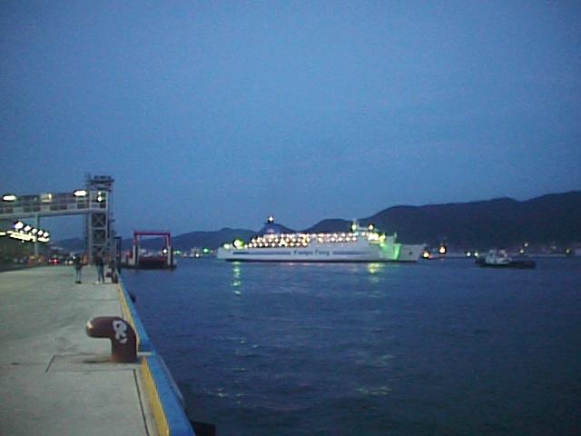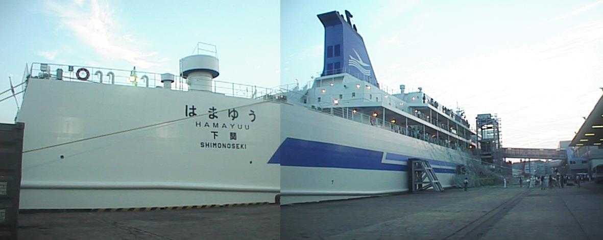 はまゆうで〜す。今までの船名は日本所有が「フェリー関釜」、韓国所有が「フェリー釜関」で非常に単純明解でしたが、おもしろくもなんともありませんでした。だけどこんどはおしゃれになりました。はまゆうは下関市の花なのです。大きさは7,560トン、162m、貨物積載能力は3,750トンで「フェリー関釜」より一回り大きくなりました。旅客定員は500名で、この日は450人程度が乗っていたそうです。御値段は40億円。(27KB)