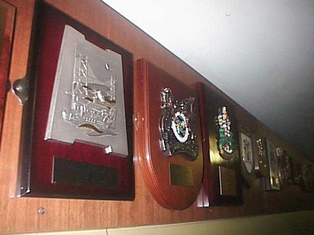 早速艦内に入ります。廊下の壁上部に「しらせ」が1983年に就航して以来交流してきた船や港と記念に取り交わしたレリーフが並んでいます。浅葱がざっと数えたところでは69個ありました。最も左手前のものは我が「下関港」のもので、関門橋が彫られています。では門司港のはどんなデザインなのでしょう? よく見てくれば良かったなと思いました。(28KB)