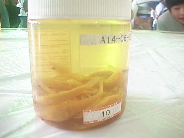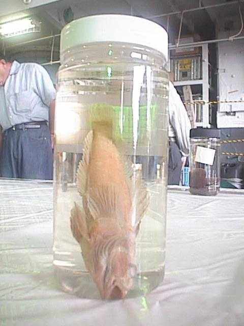 観測隊の展示コーナーに来ました。生物標本では魚が5種(ショウワギス、ウロコギス:これらはキスと言っても日本のキスとは違う、ライギョダマシ、キバゴチ、ナンキョクゲンゲ)ありましたが、浅葱に言わせると全部同じでハゼの親玉みたいなもんです。これはキバゴチです。コチと言っても日本のコチとは違う?(31KB)