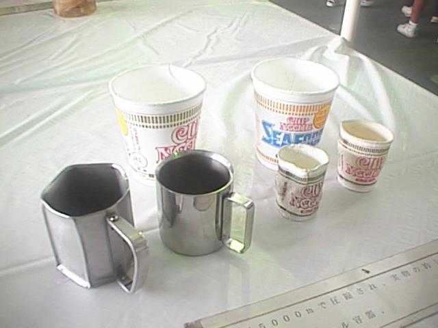 これは水深5,000mの深海の圧力で圧縮された容器です。右のカップめんのスチロール製容器はおよそ1/10の大きさになっています(そう書いてありました)。左のステンレス製カップは円柱状のものが多角柱になってしまっています。浅葱が潜ったらウエストサイズが今の半分くらいになるかも。(27KB)