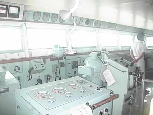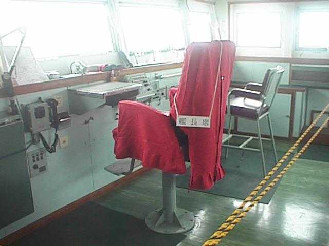 真っ赤なカバーの艦長席です。同じカンチョウでも館長とはえらい違いですな。進行方向に向かって右寄りにありました。これは私が過去に見たほかの船でもほとんど同じで、最高責任者の席というのは大方の位置が決まっているのでしょうか?(29KB)