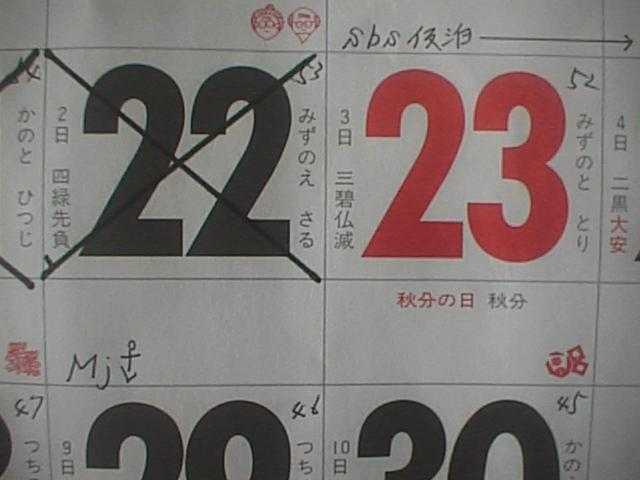 艦橋内のカレンダーです。22日の左下隅に「Mj」と「イカリ印」(社会科で勉強した地図記号のあれです)が小さく書いてあります。これはMoji港に入港(イカリを下ろした)という意味なんですね。反対に出航するときはイカリを上げるのでイカリ印は上下逆さまに書くことになりますね。これはこのカレンダーを見ていて浅葱が自ら発見したことです。こう見えてもかなりの接写なのでフォーカスには苦労して何度も取り直しました。ほかのお客さん達は、浅葱がカレンダーに張り付いてゴソゴソしていても誰一人関心を示さなかったけど。日付の右上の数字は何かのカウントダウンのようです。(27KB)