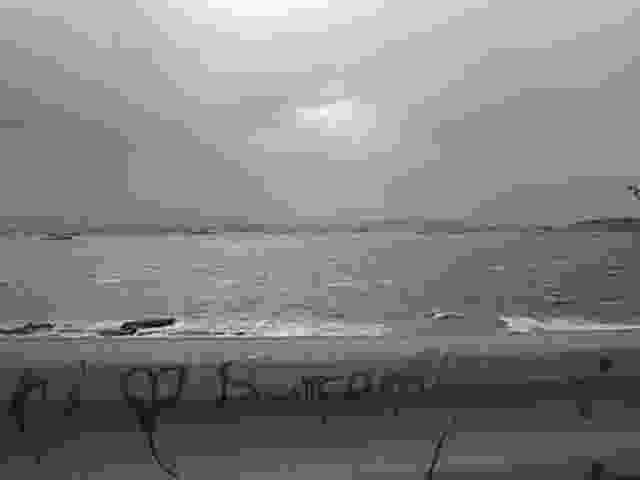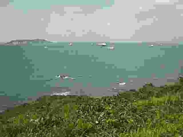 新垢田の高台から見た冬の響灘です。 この荒天のため関門海峡に進入できず停泊する船がたくさん並んでいます。よく見てください、船はみな船首を同じ方向に向けています。船首を風上に向けることで、波の影響をなるべく避けようとしているのです。