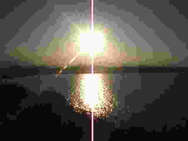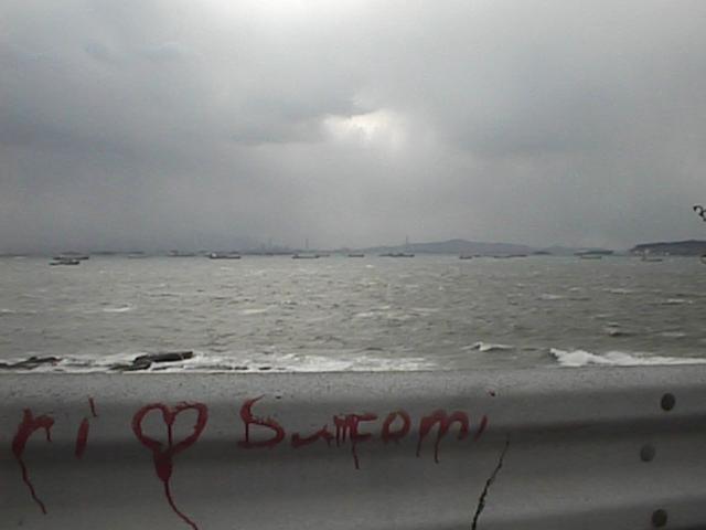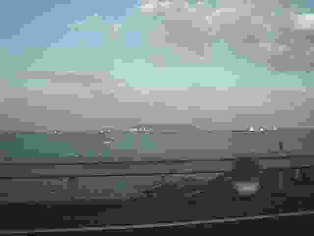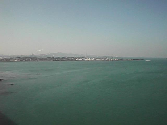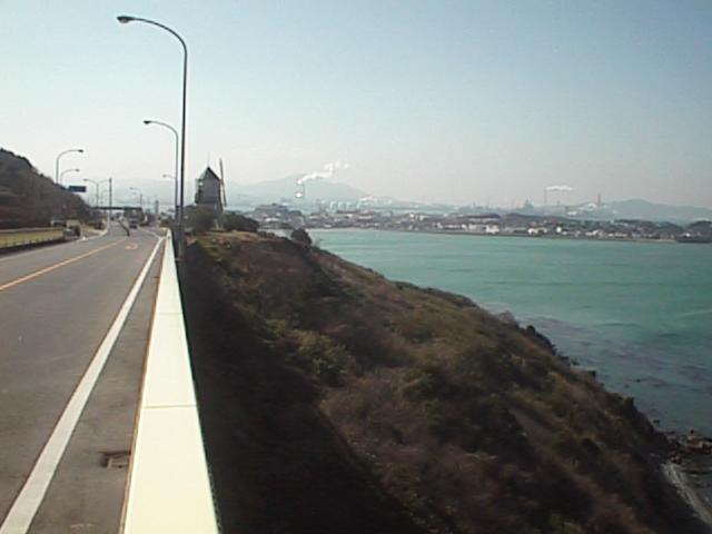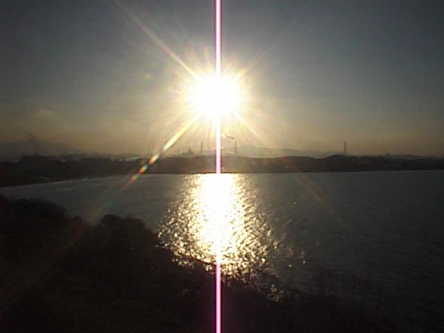 もうすぐ日没です。彦島の向こうに北九州工業地帯の煙突が見えますね。その向こうに九州の山々が見えます。太陽の通り道が南よりである冬の間はこの山の向こうに沈みます。この辺りで見る日没はアマチュアカメラマンの格好の被写体のようで、この日も大勢の人々がパーキングよりやや南(彦島側)の路側帯に陣取って三脚を並べていました。1998/01/31 (23KB)