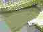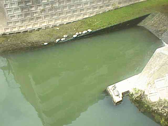 浅葱はこれまで、ここには4匹のカメしか住んでいないのだと思っていました。この1年ばかり観察を続けてきましたが、5匹以上は見たことがなかったからです。ところがどうでしょう、川の向こう側と手前右のコンクリートの上に合わせてなんと11匹も並んでいました。(19KB)