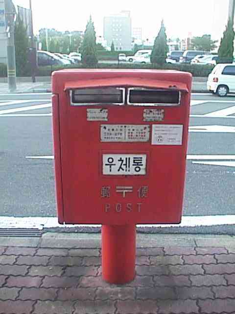 下関は日本でただ1ヶ所、定期国際航路を2つ持つ都市です。そのひとつが韓国・釜山に向けて毎日1便出ている関釜航路です。ターミナル前には韓国からのお客さんのために、日本語とハングルが併記されたポストが設置されています。市内ではハングル表記をあちこちで見かけます。(25KB)
