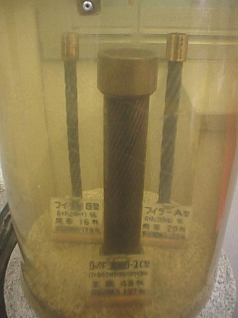 壇ノ浦PAは下関ICから高速道路に入り、下り九州方面に向かってすぐのところにあります。関門橋を渡る手前です。これは関門橋のメインケーブルの模型で、断面の構造がわかるようになっています。(27KB)