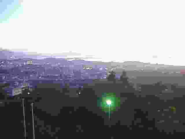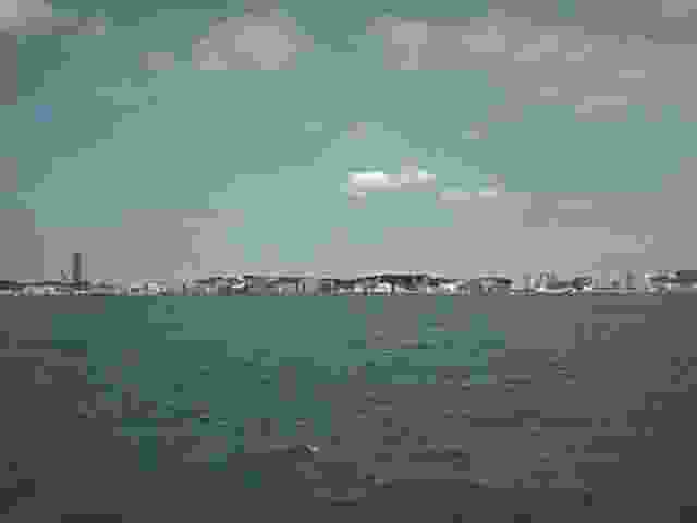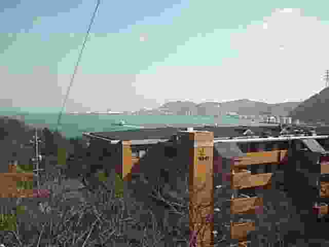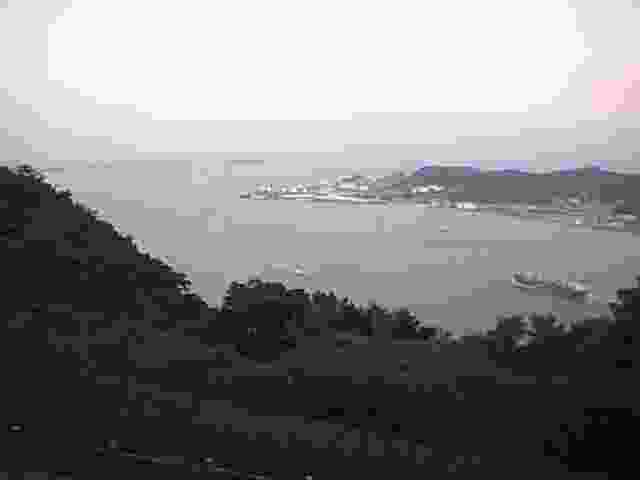 視線をぐるっと右に移動して、これは下関の市街地の向こう側、西側です。見えている海は響灘(ひびきなだ)つまり日本海で、もうじき日が沈もうかというところです。手前の陸地はもちろん下関本土で、前方になんとなく見えるのは(見える?)は九州本土、その間に平たいと言うか左右に細長く島が写っているはずなのですけど、それが彦島と彦島の西端にくっついている竹の子島です。右手の海に浮かんでいるのは六連島。こんな写真にそんな説明じゃ〜全然わからんと言うお客さんは下関に来なさい。館長がご案内いたします。