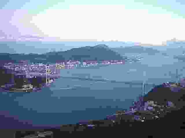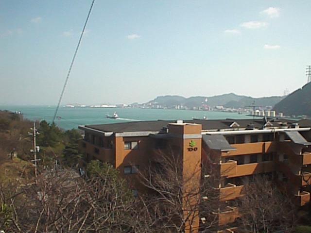 山頂(268m)までのコースは3つです。遊歩道を歩く、ロープウェーに乗る、車で有料道路(山頂の駐車場代を含んで普通車400円)を上る、です。ロープウェー乗り場まで来ました。ちょっと海を見てみましょう。この写真は関門橋より東側の様子です。橋は右手になります。ここはまだ低いので景色は良くありません。1998/01/31 (37KB)