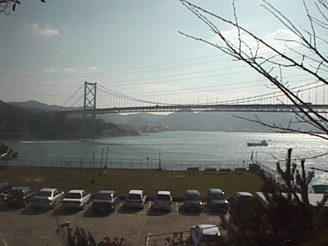 下関は平地が少ない町で、市内には小さな山や丘がいくつもあります。高いところから景色を見るには非常に便利な地形であると言えましょう。中でも瀬戸内海国立公園の西の外れの飛び地「火の山」は一番のお勧めです。ここは海岸線を通る国道9号線と火の山登山道がぶつかる三叉路です。前方に関門橋が見えますように、浅葱は今、海を前に山を後ろに立っています。国道通行中の車の列が写っていますが左端の車はまさに火の山側に左折しようとしています。1998/01/31 (44KB)