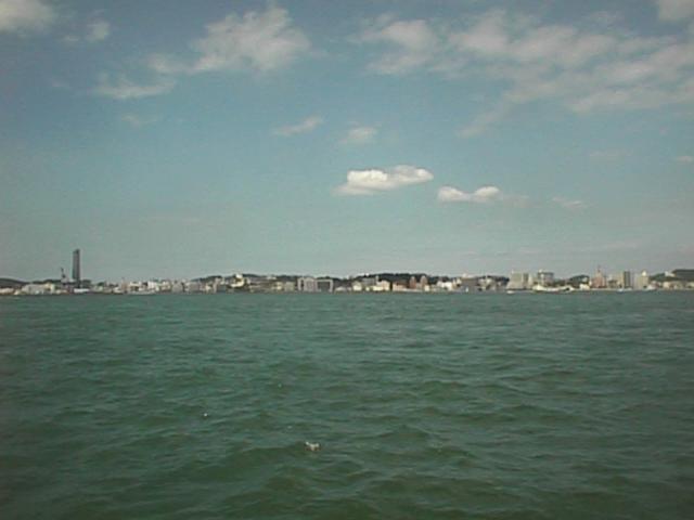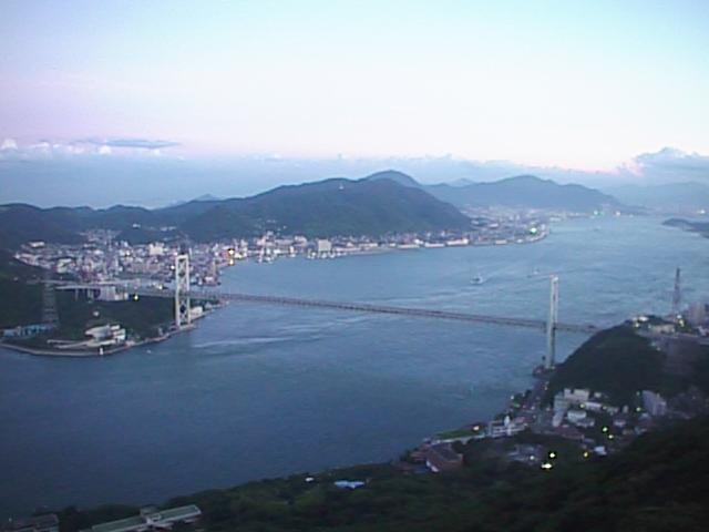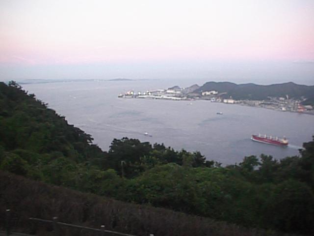 日を改めて夕刻山頂まで上りました。山頂には戸外の展望所もありますが、一番高いのは3階建ての展望室に上がることです。ただし窓ガラス越しに見ることになります。この写真は関門橋より東側です。橋は右手になります。正面の陸地は北九州市門司区の北端で、これより東は海峡の幅が急に広くなって海が開けます。それが周防灘(すおうなだ)つまり瀬戸内海です。関門橋より東側で、周防灘が始まる手前までの海域を特に「早鞆(はやとも)の瀬戸」と呼びます。1998/08/05 (24KB)