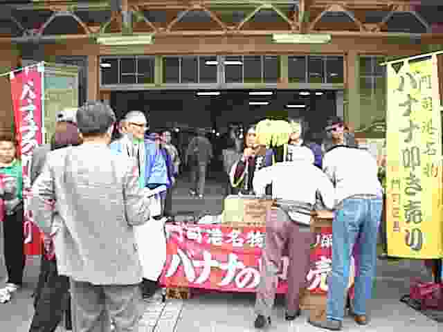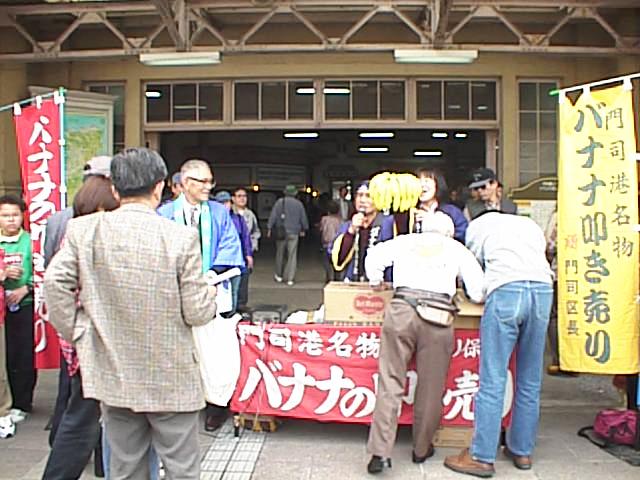 駅舎前で「門司港名物バナナのたたき売り」をしていました。門司が発祥の地だそうですが、これもなかなか見る機会はなくなりました。浅葱は都合により買いませんでしたが、けっこう売れていました。(61KB)