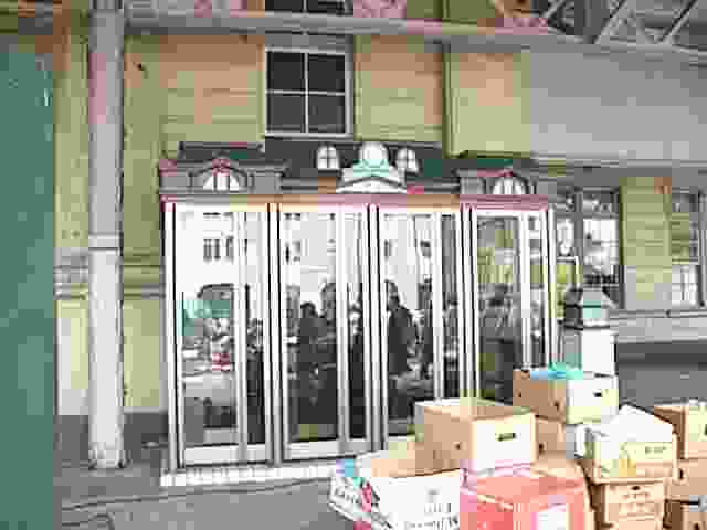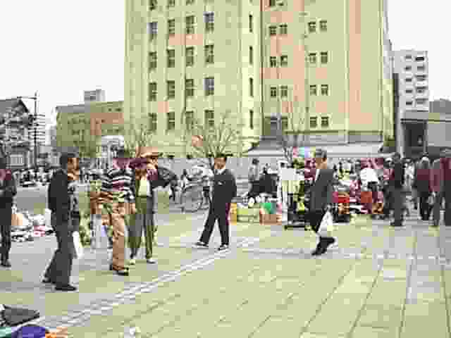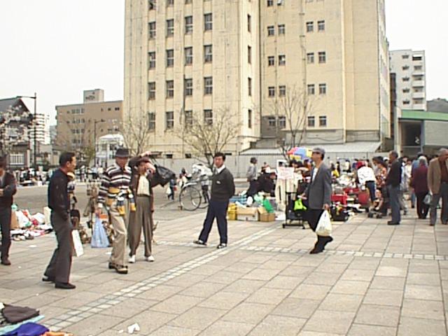 駅前の広場ではフリーマーケットが行われていました。わりと頻繁にやっているようです。浅葱もこれまでなんどか見たことがあります。写真中央よりやや左の奥に人力車が写っています。これに乗ってレトロ見物はいかがですか? (57KB)