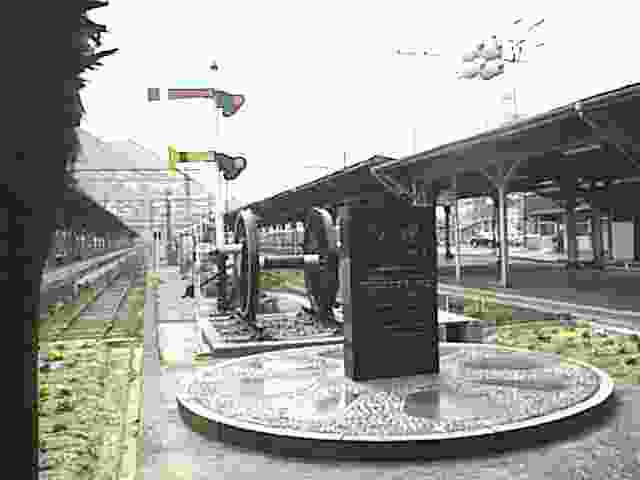 改札を通って中に入りました。手前の石碑は「0哩(ゼロマイル)標」と言って、ここが鹿児島本線の始点であることを示しています。ここでレールがぷつりとちょん切れているのです。その向こうは蒸気機関車の車輪だと思うのですけれど。大車輪を3対持つC型のものかなと思いますが、なにぶんよく見て来ませんでしたのでわかりません。すみません。(52KB)