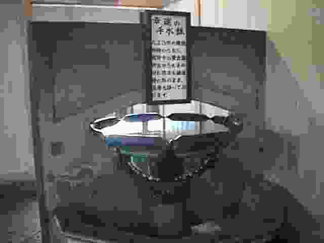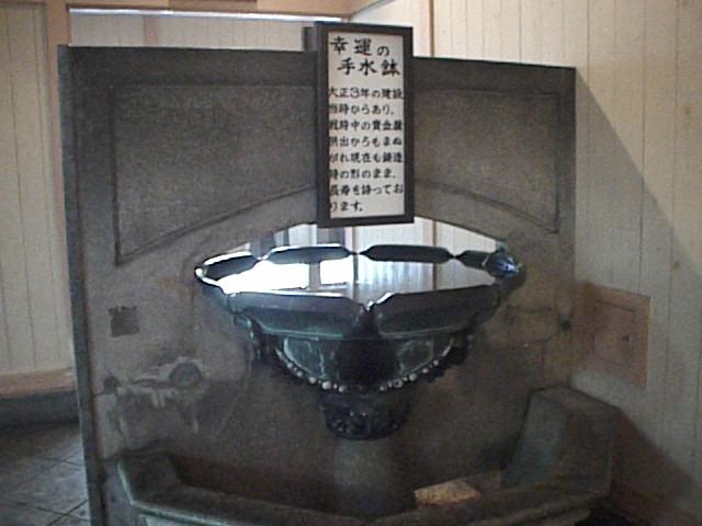駅舎内のトイレ前の「幸運の手水鉢」です。このような物体は往々にして賽銭箱と間違えられ、水の中に小銭が投げ入れられているものですが、この手水鉢はどうでしょうか? 見に来てください。