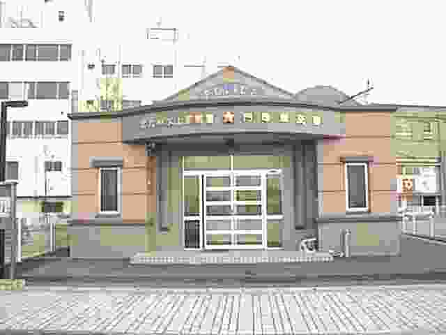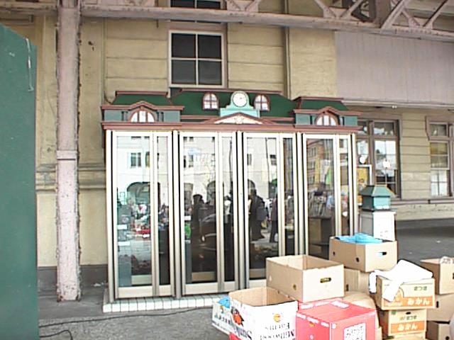 駅舎前の電話ボックスです。これは駅舎の形を模したものと思います。この日は駅前広場での催しの関係で段ボール箱がなどが写っていますが、普段はありません。(54KB)