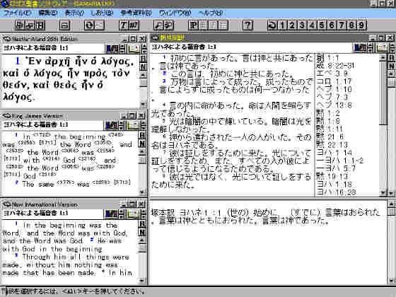 います。画面にはこれら複数の聖書訳が同時に表示できますので比較しながら読むことができ、理解の助けになります。