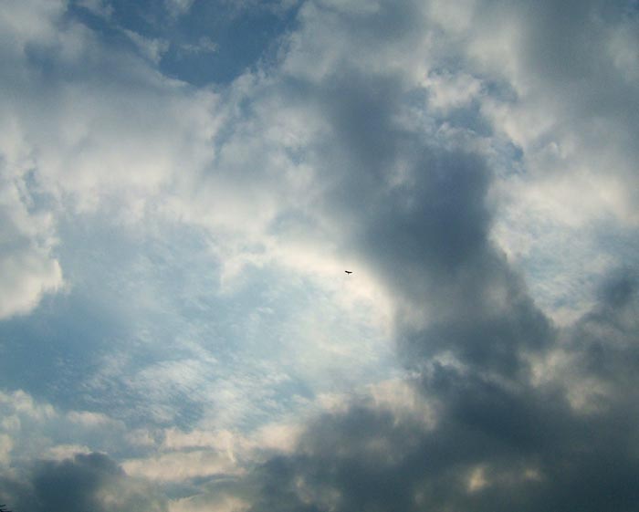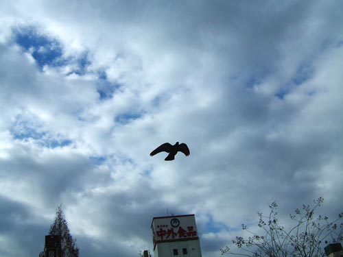 2月23日 撮っていたら高く舞い上がった鳥。下は環状7号線の舗道。車が激しく 行き交っている。一羽の鳥で、空が深く思えた。 家ではシロとクロがごろんと横になる食卓のテーブルふきんの床の場所とりで 短い交戦をした。いつもはシロが勝つが、きょうは執着をみせたクロが粘り勝ち。 片手を挙げて相手の頭をちょっと叩き、にらみ合う。そのとき姿勢が低くなっ た方が負けなのだ。勝ったクロは、おもむろに仰向けになって寝転び、目を細めた。 シロはしかたなく尾をさげて部屋の端にあるソファーの背に飛び乗り、知らん顔。 猫は都合が悪いときときどき知らん顔をする。えっ、何かあった?というような、 ふりをする。ふりができるなんて、なかなかやるじゃないか、と思う。 [空を見る]