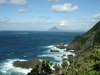思ったよりも近く、15分程行くと展望台に到着、本土最南端です。灯台は島のようになっていて歩いてはいけません。天気は良いし、海は真っ青で船が白い線を付けて走っています、遠くには開聞岳が見えます。